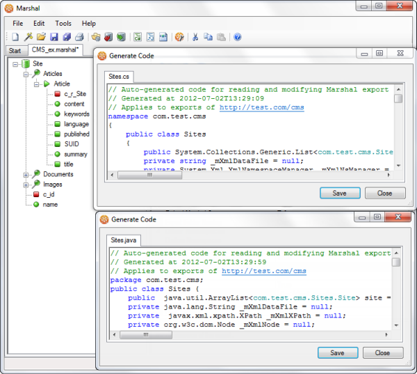 For easy reading and writing of exported XML, the Marshal Editor provides built-in c# and Java code generators. Use them when writing export post-processors for transformation purposes or when loading data into external systems, such as a data warehouse or a long-term archive.